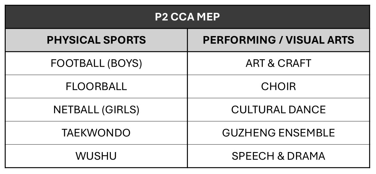 The following CCA is open to all Primary 3 to Primary 6 students and is designed to provide students with opportunities to explore their interests, develop new skills, and engage with their peers. Participation in CCA is highly encouraged and is an integral part of a well-rounded education. To ensure that students have the chance to focus and develop their skills in a single area, each student is limited to participating in only one CCA from any of the available groups.