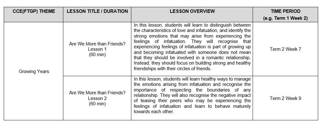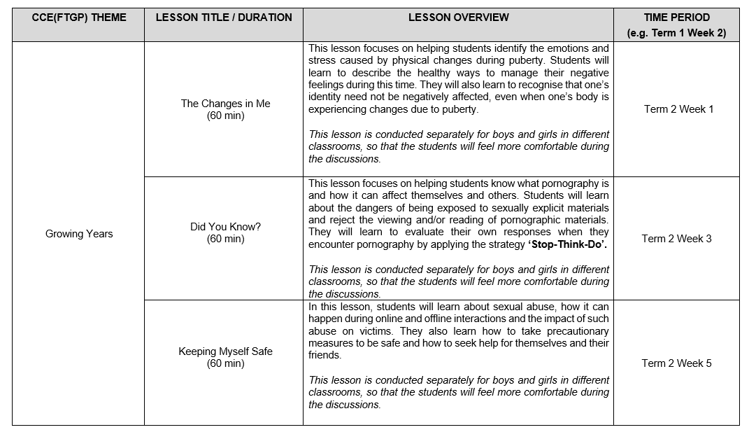7. Sexuality Education (SEd) lessons are taught as part of CCE (FTGP) at Primary 5 and 6. Through these lessons, students will learn healthy ways to manage the physiological, social and emotional changes in their growing years. They learn to build healthy and rewarding relationships with others, including those with members of the opposite sex. Students are also guided to make wise, informed and responsible decisions to keep themselves safe from sexuality-related risks.