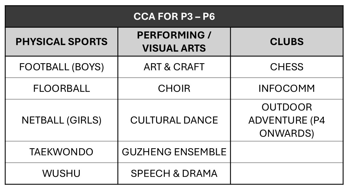 The following CCA is open to all Primary 3 to Primary 6 students and is designed to provide students with opportunities to explore their interests, develop new skills, and engage with their peers. Participation in CCA is highly encouraged and is an integral part of a well-rounded education. To ensure that students have the chance to focus and develop their skills in a single area, each student is limited to participating in only one CCA from any of the available groups.