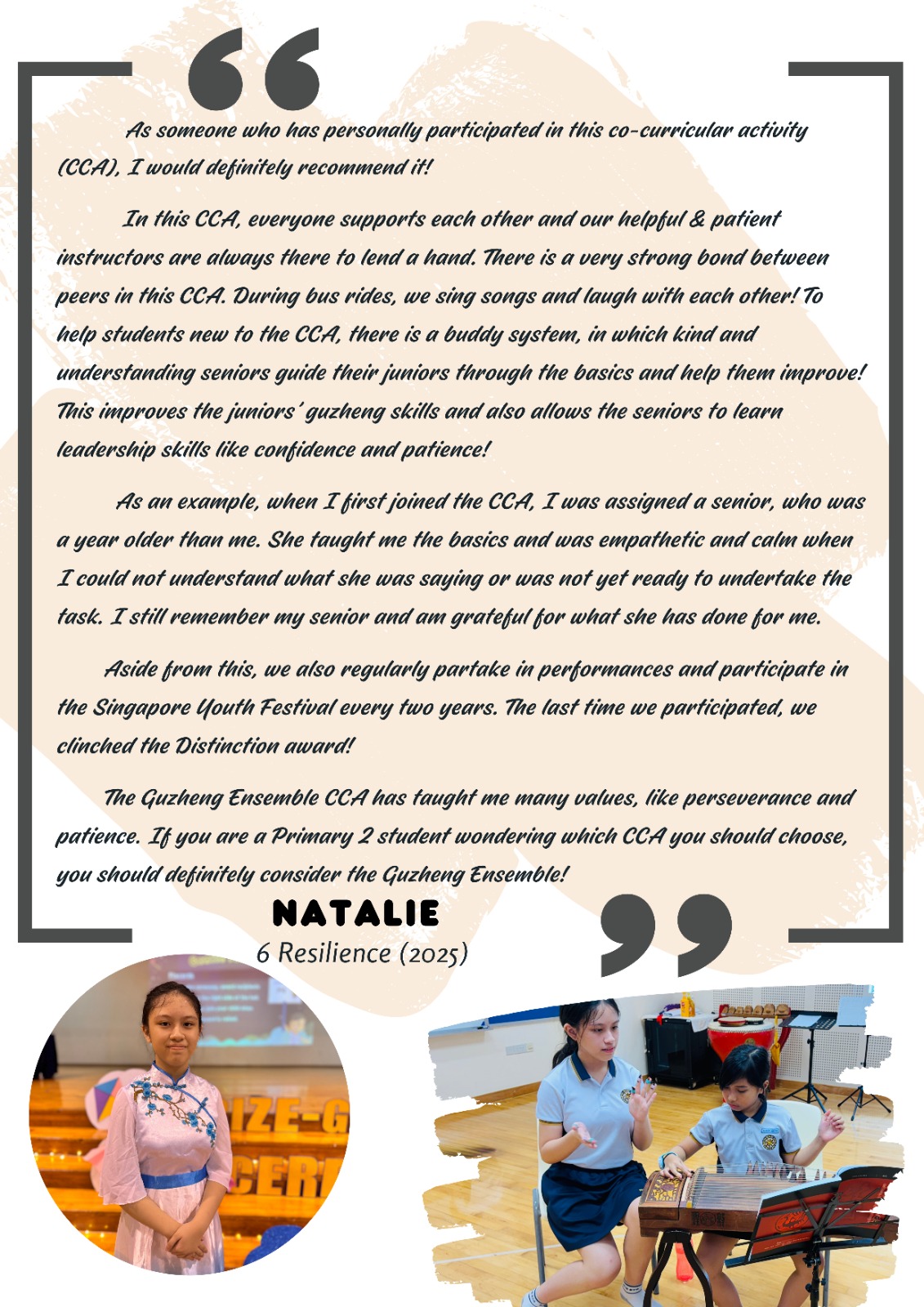 Through a variety of performances — including the Chinese New Year Concert and National Day Concert — students gain valuable experiences that enhance self-esteem and confidence. Ensemble playing nurtures teamwork, camaraderie, and a strong sense of collective responsibility. In addition, students cultivate resilience and humility as they commit to rigorous practice schedules in preparation for these events.